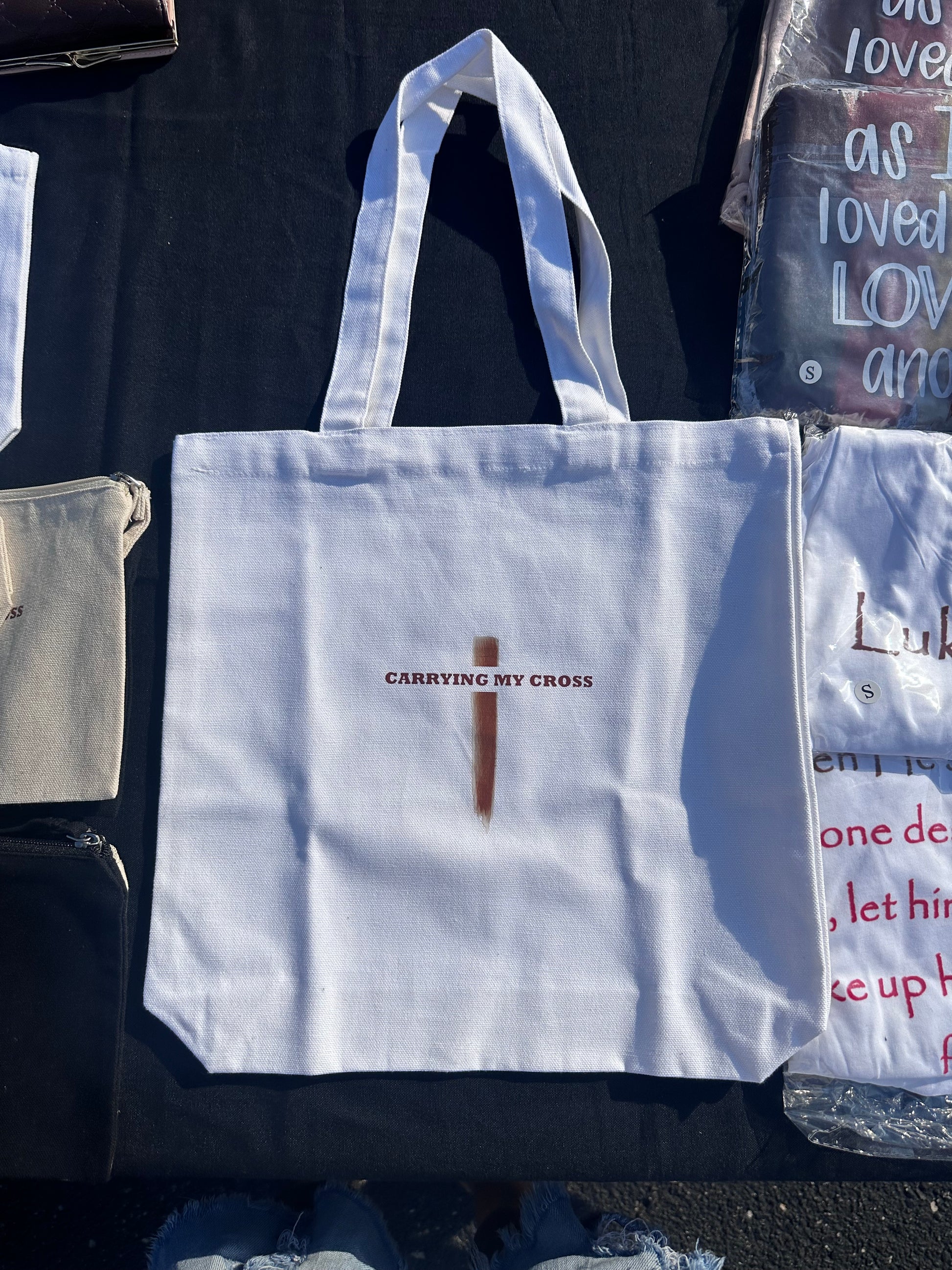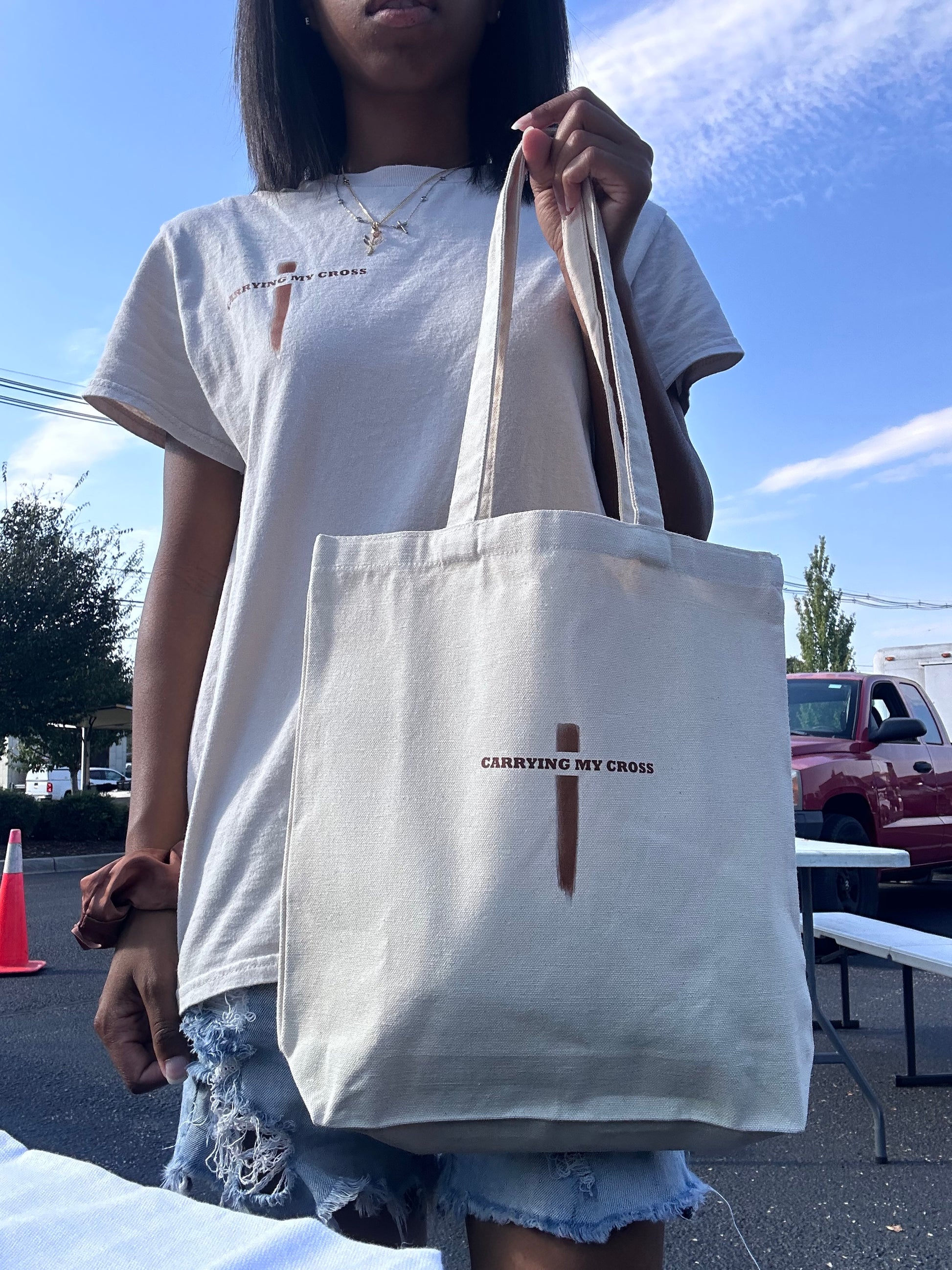 Carrying My Cross logo is in the center of the canvas bag on one side.