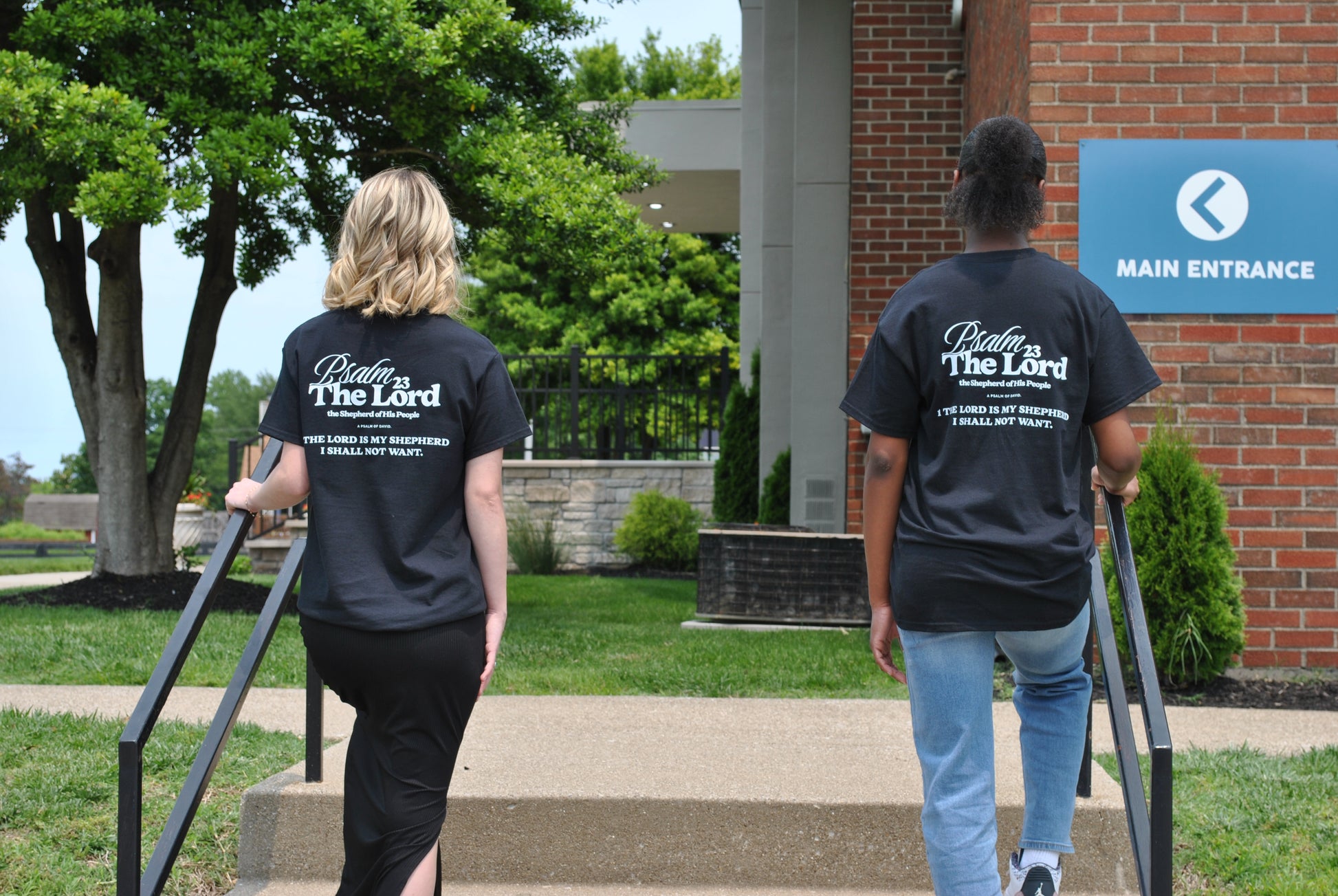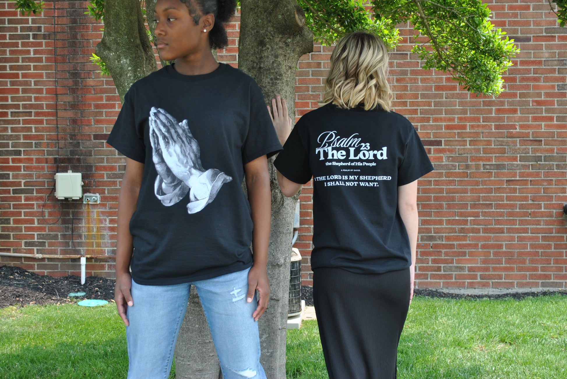 The color of the shirt is Black, with Prayer Hands on the front of the T shirt in black, grey and white and Psalm 23:1 Scripture is on the back, in the color white.